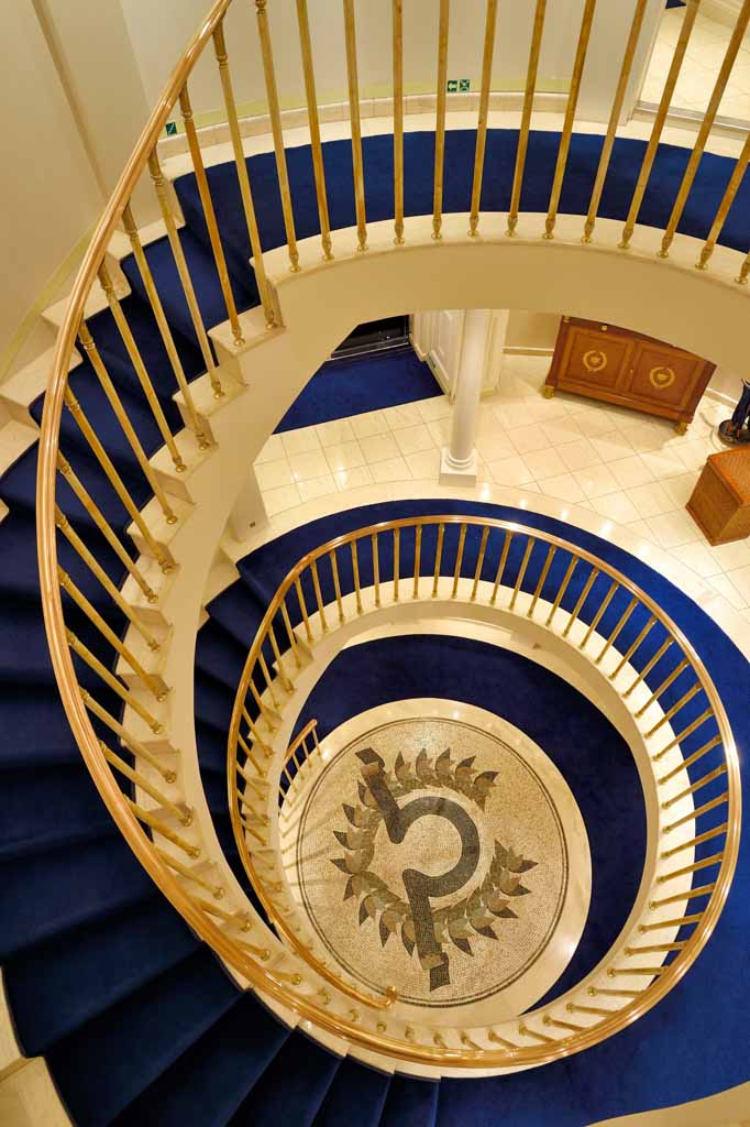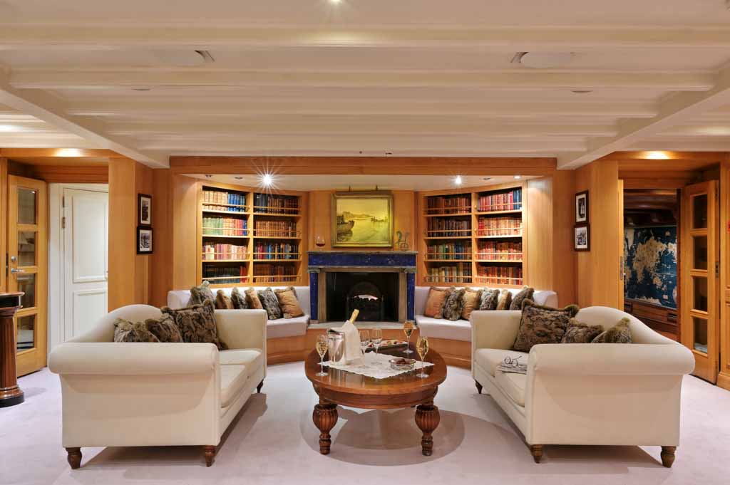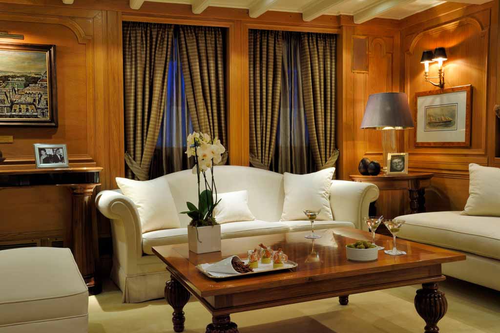 Christina O's expansive interior was completely gutted during her most recent refit, with notable artefacts salvaged and sensitively restored. After most on the main deck is the Lapis Lounge, named after its original lapis fireplace, which remains in place, and decorated in the style of an English country manor house. The main deck is also home to a dining salon with a 24-seater table, and the Aris Bar, which boasts its original rope-covered bar, whale fang bar handles and whale-skin bar stools. A majestic atrium with a striking mosaic of the Onassis omega logo then allows guests to access the two further salons on the promenade deck above via a spiral staircase.